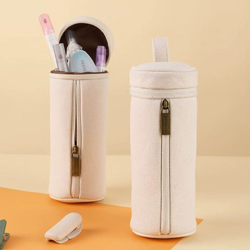 This cylindrical pencil case is a game – changer for stationery organization. It features a durable, textured outer fabric similar to canvas or linen, and a soft inner lining. The tall, rounded shape is different from traditional pencil cases, and it comes with a dual – zipper system for easy access and secure storage.
