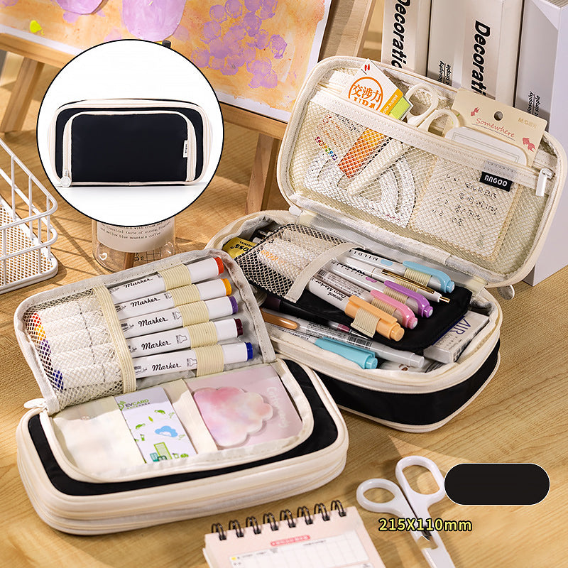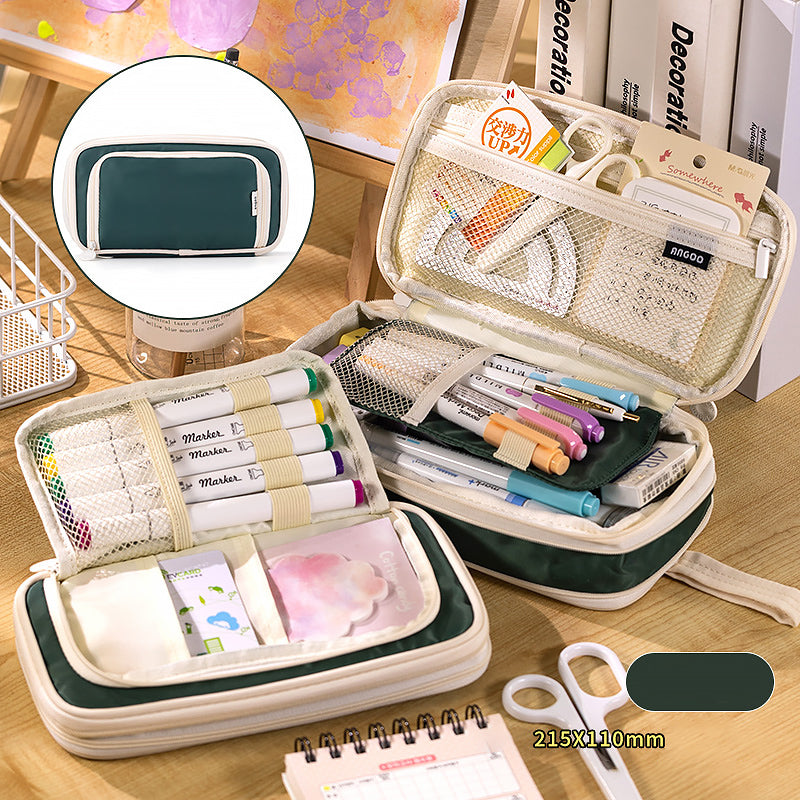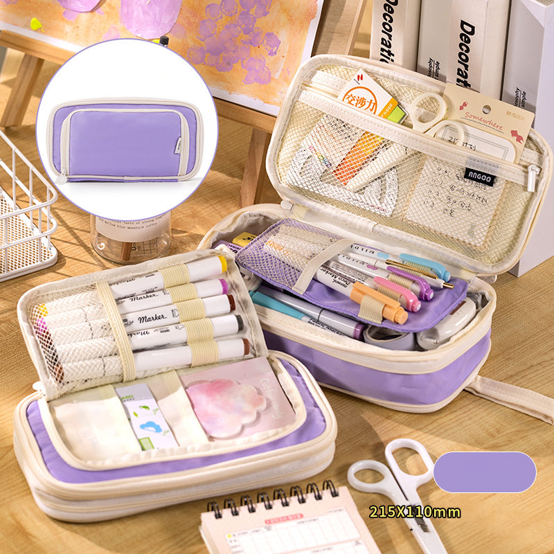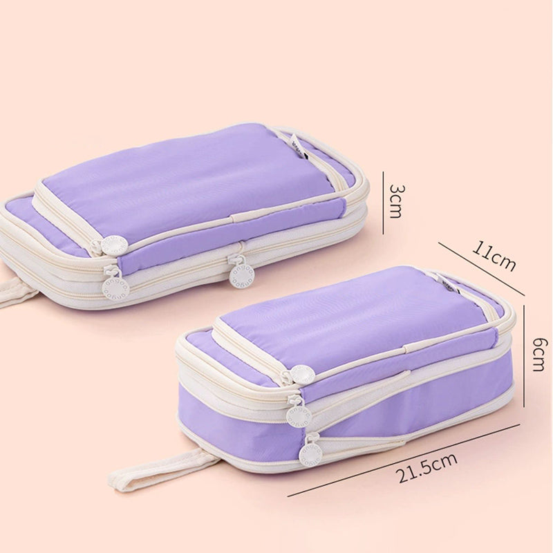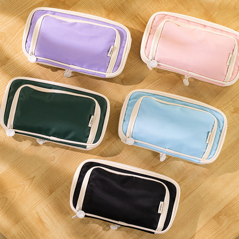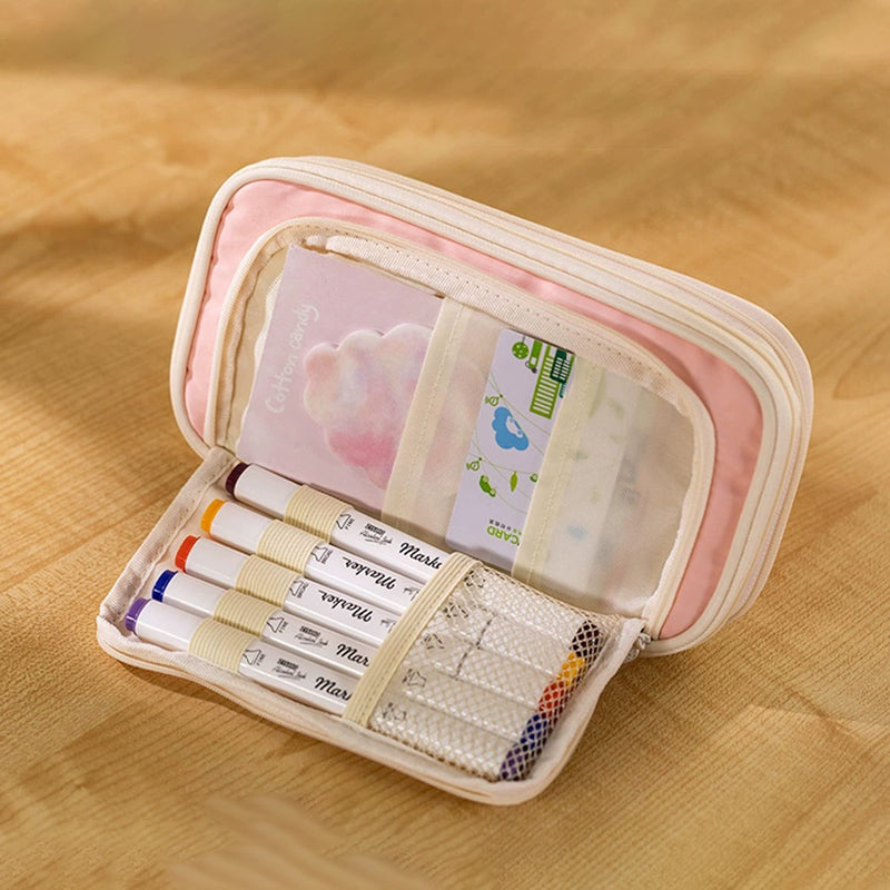 This large-capacity pencil case is a practical solution for organizing stationery. It features a smooth, durable synthetic exterior, likely nylon, that offers water resistance. The interior has mesh pockets and soft fabric sections, and it comes in a variety of pastel colors with cream/white accents, presenting a clean and minimalist look.