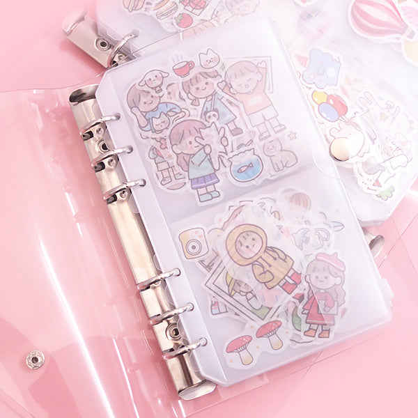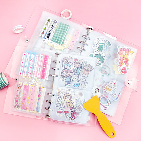 This refillable organizer/binder system offers a practical and aesthetically pleasing solution for organizing small stationery and craft items. It includes transparent plastic pocket pages with different opening configurations and binder accessories. The clear pockets make it easy to view contents, while the various components like dividers and zip pockets help keep everything well – arranged.