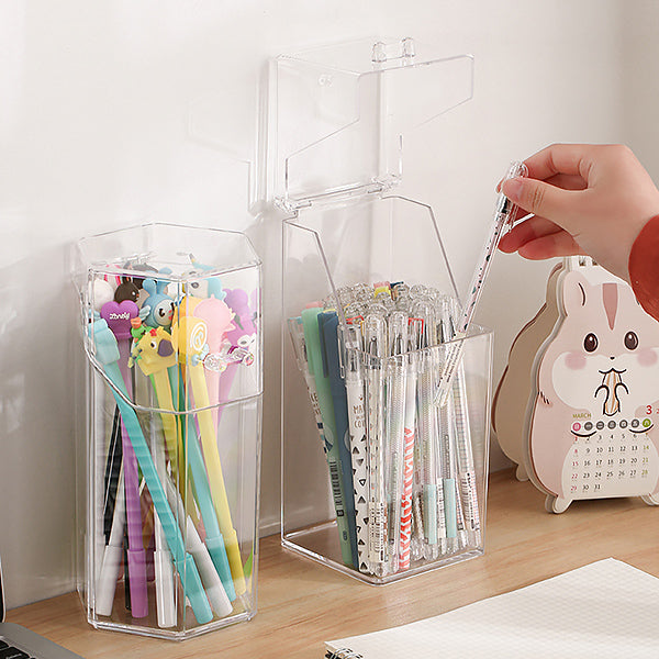 This stationery storage organizer is a great addition to any workspace. Crafted from clear, durable plastic, it comes in various geometric shapes like cylinder, hexagonal prism, and square prism. The transparent design allows you to easily identify the stored items, while the lids with clasps keep them dust – free.