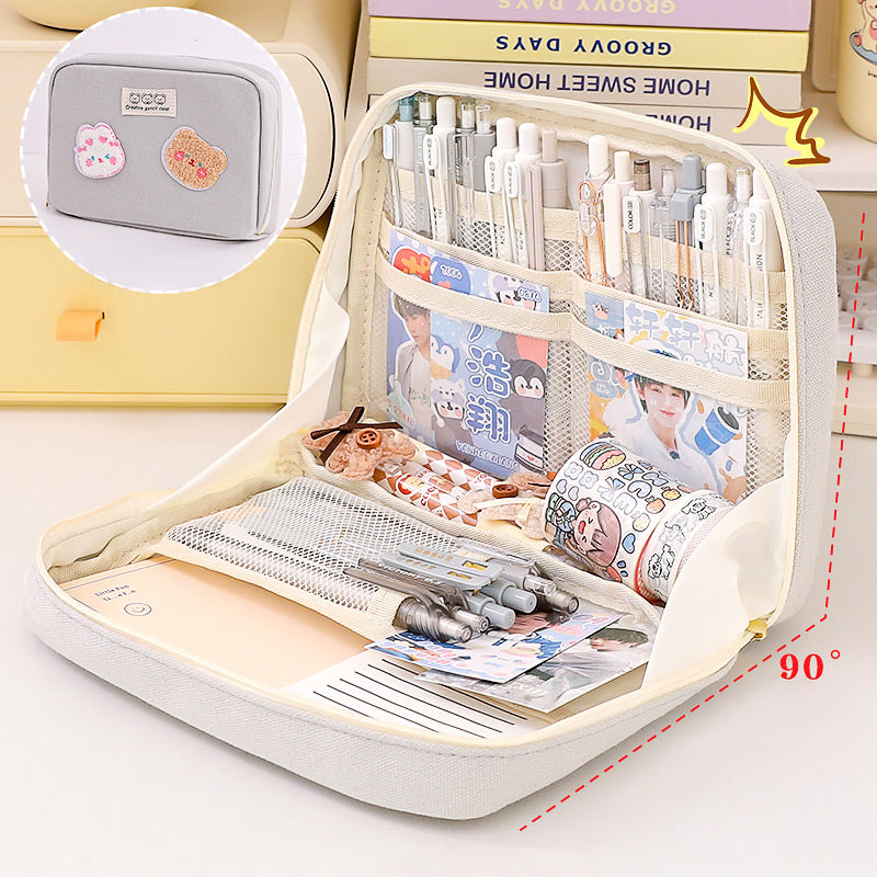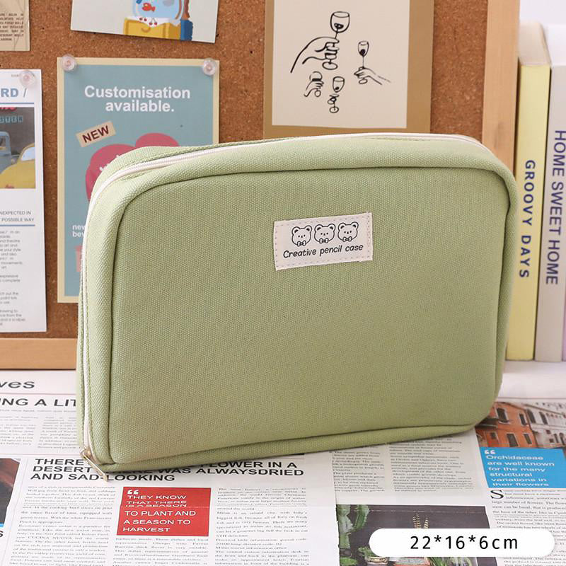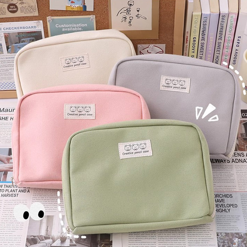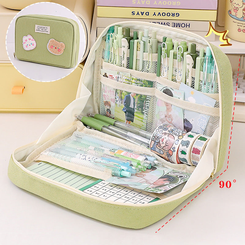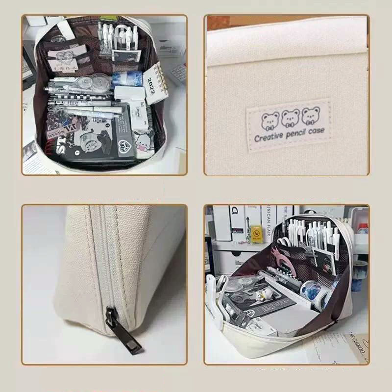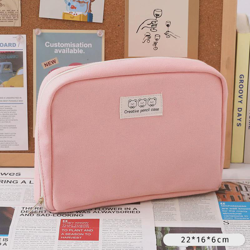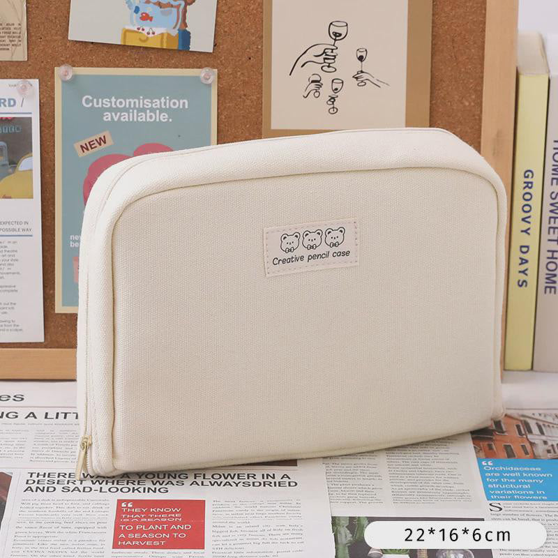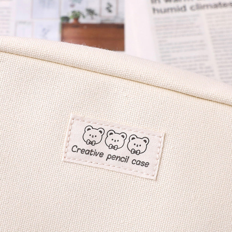 This stationery organizer is a stylish and practical solution for keeping your writing tools and small office supplies in order. It features a large capacity with multiple compartments to hold various items. The outer is made of a sturdy woven fabric, and it comes in appealing soft colors with a cute bear illustration on the front.