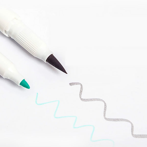 - Dual-tip system with a flexible brush tip and a super-fine tip